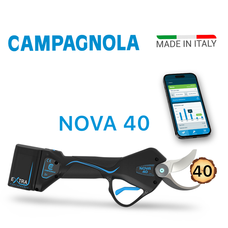 Nove Aku škare NOVA 40, kompaktne su škare sa izduženom ručkom za optimalan i precizan rad. Imaju najnoviju generaciju motora bez četkica, koji osigurava pouzdanost i optimalnu izvedbu uz smanjenu potrošnju, te mogu doseći 100 rezova u minuti. Motor bez četkica omogućuje rezove do promjera 40 mm, pa se preporuča koristiti za vinogradarstvo, voćarstvo i maslinarstvo. Oštrice od čelika visoke čvrstoće omogućuju čiste i precizne rezove bez neravnina. Škare NOVA 40 mogu se povezati s aplikacijom putem Bluetootha za kontrolu parametara škara.