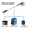ALICE STAR ECO akumulatorski je tresač maslina opremljen fleksibilnim, otpornim i zamjenjivim zubima od tehno-polimera i fleksibilnim poliuretanskim kabelom za napajanje. Ovaj model opremljen je aluminijskim teleskopskim produžetkom od 150 do 220 cm, te se tresač može napajati pomoću litijskih ili standardnih akumulatora 12V, kao i elektro-agregatom Campagnola Energy 4 koji omogućuje istovremeni rad s 4 tresača.